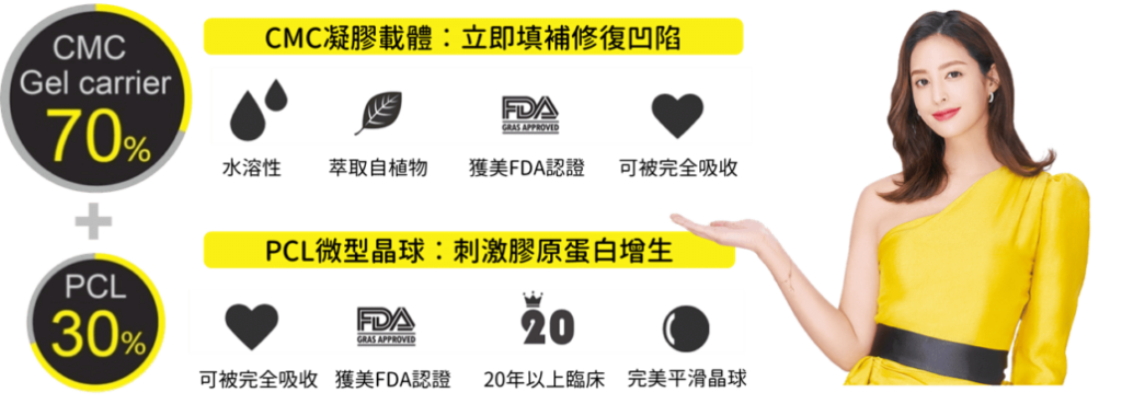 | 主要成分 | PCL 晶球 + CMC 凝膠 | 聚雙旋乳酸空心微球體 (Poly-D,L Lactic-Acid, PDLLA) + CMC 凝膠 | 聚左旋乳酸結晶體(Poly-L-lactic acid, PLLA) + CMC 凝膠 | CaHa 微晶球 + CMC 凝膠 | 聚雙旋乳酸晶球 ( PDLLA) + HA 凝膠 |