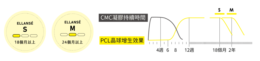 Ellansé 洢蓮絲原廠推出 S、M、L、E 共 4 種劑型,目前台灣衛福部核可的是 S 劑型與 M 劑型,兩者因膠體與晶球的鏈結程度不同,其維持的時間也有所差異。