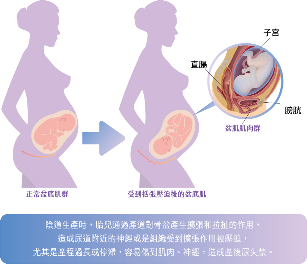 – 生產時,胎兒經過產道,骨盆底肌會被過度伸展甚至撕裂,造成肌肉張力下降。