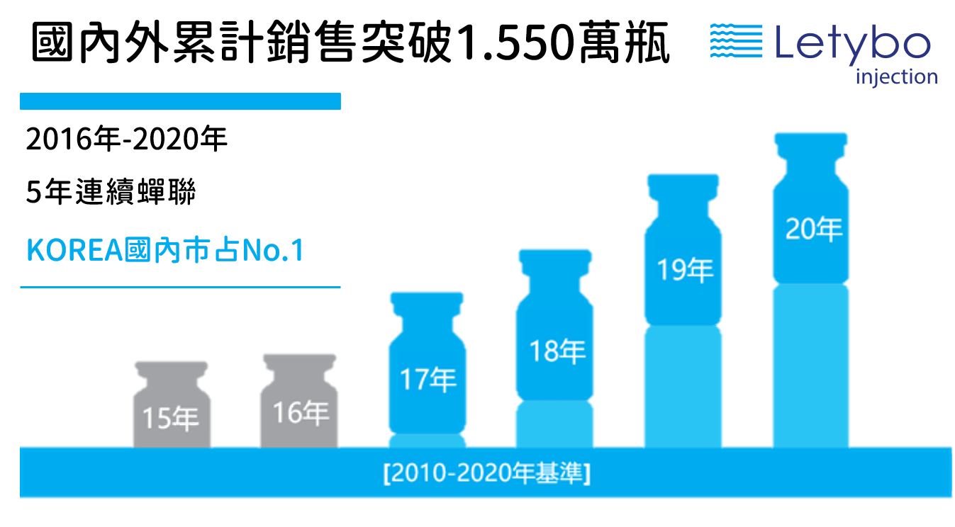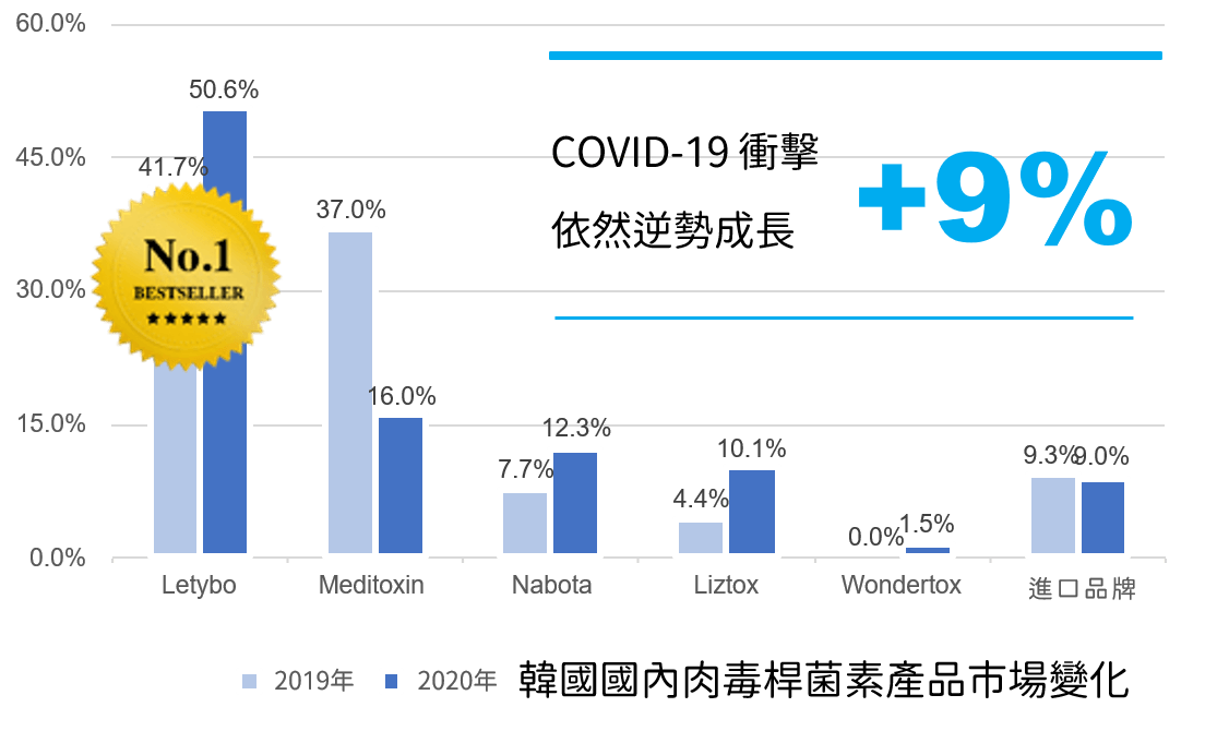 在這個白熱化的市場競爭下,韓國本土品牌掌握約 70% 的肉毒市占率,其中又以 保提拉肉毒(Letybo)最為亮眼。自 2010 年上市後,僅 3 年即登上韓國市占率第一的寶座,並多年穩居龍頭,銷售至全球 28 個國家,更是 日本市場最受歡迎的韓國肉毒品牌。