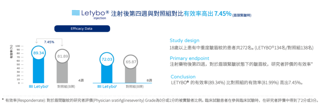 Letybo保提拉肉毒來台上市前,歷經近五年時間,經過三軍總醫院、林口長庚醫院、台北長庚醫院、國泰綜合醫院等多中心設計的第三期臨床實驗,以212名受試者以雙盲、隨機、活性的對照比較,證實有效改善二至三級之中度及重度皺眉紋,可做為美國肉毒品牌的替代品,提供台灣民眾CP值高的新選擇。