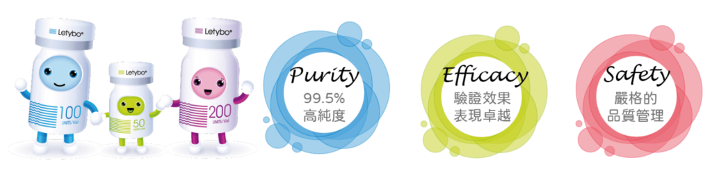 | 肉毒品質 | Botox保妥適肉毒 | Dysport皇家肉毒 | Xeomin天使肉毒 | Neuronox優力柔肉毒 | Letybo保提拉肉毒 | Nabota娜柏塔肉毒 |