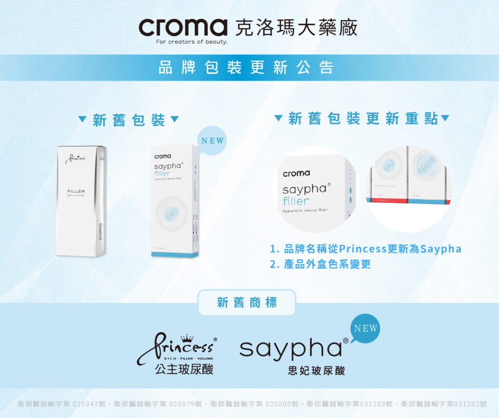 為了提供更優質的醫美產品,Croma克洛瑪大藥廠已全面推動全球品牌升級,Princess公主玻尿酸正式更名為 Saypha思妃玻尿酸。雖然品牌與包裝煥然一新,但主要成分與高安全性依舊不變,為消費者帶來更優質、更進步的選擇。