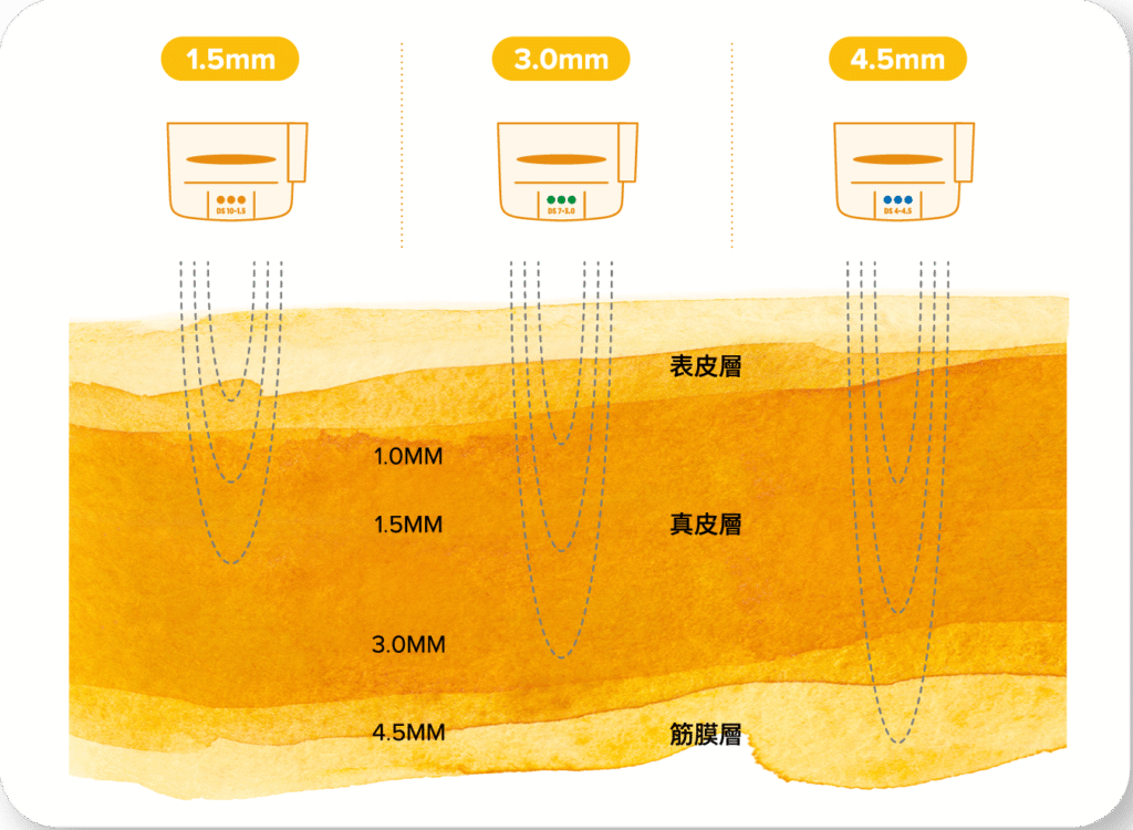 每個人的皮膚層深度不同,會依據需求及療程目標,使用不同深度的探頭,而4.5mm的探頭更可以於療程中深達SMAS層(筋膜層),不會破壞皮膚表面。